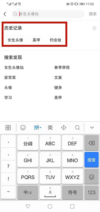 2、点击搜索框即可看到自己搜索的浏览记录。