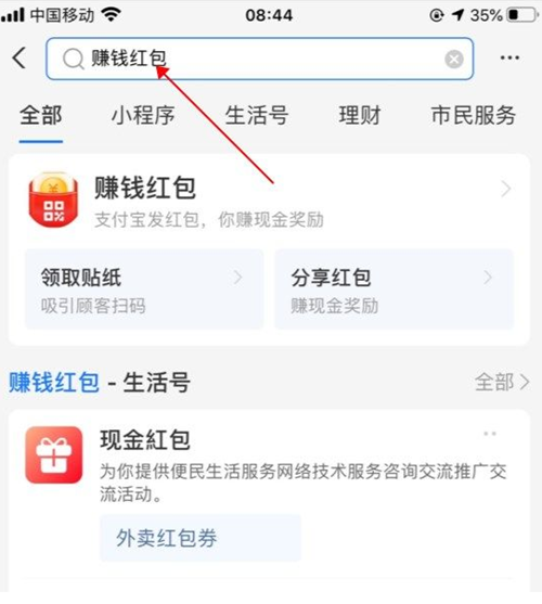1、先是打开支付宝在顶部的搜索栏之中可以进行搜索赚钱红包,点击打开。
