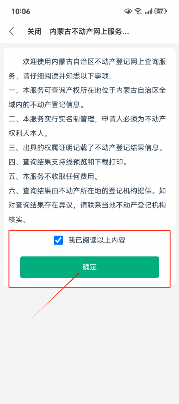 5.进入“有无房证明查询”专题后,点击页面中的查询按钮,勾选“我已阅读以上内容”后点击确定。