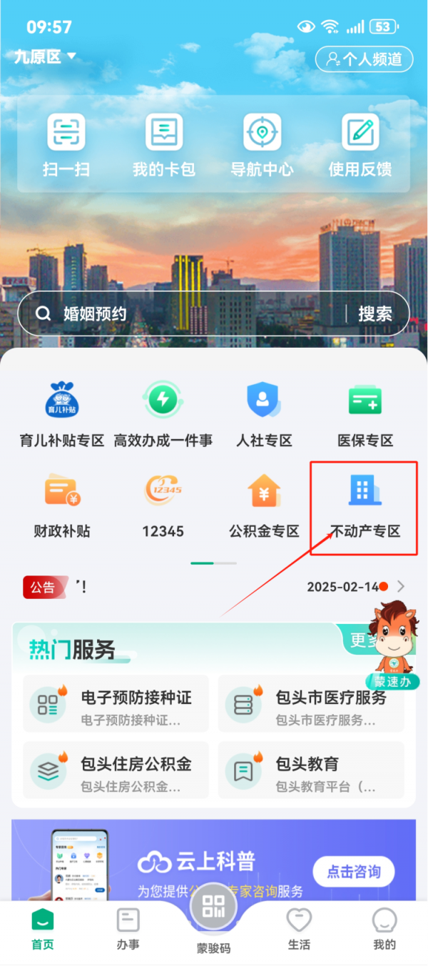 3.在首页点击“不动产专区”,完成人脸核验授权。