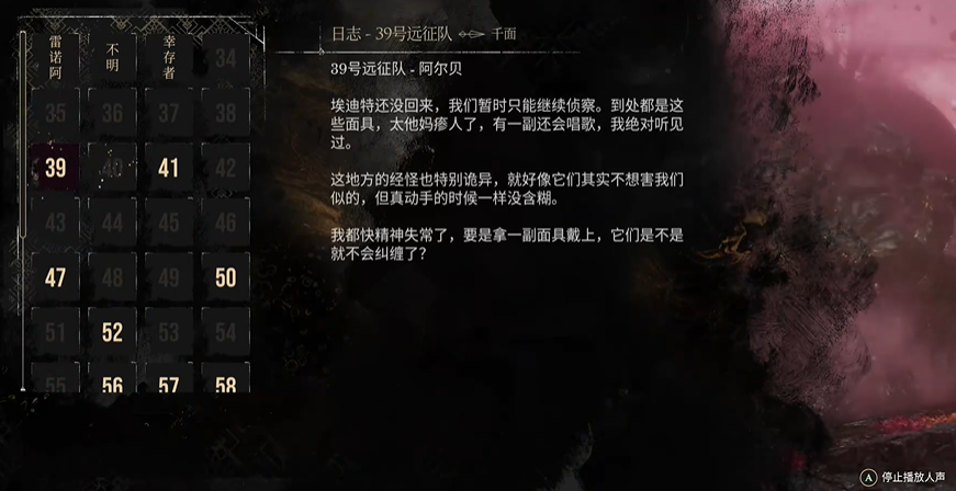 光与影33号远征队全日志收集攻略,本篇为39号远征队日志的位置分享,这份日志在千面,在主线做到打车由泰坦千面的时候去拿就行。