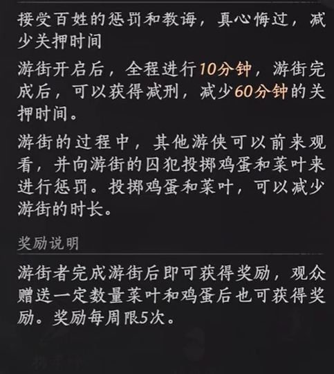 这样游街可以减刑,游街全程为10分钟,游街完成后可以减少60分钟的关押时间,被丢东西可以减少游街的时长。