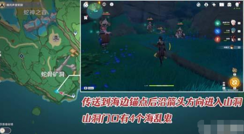 4、调查后派蒙会给出建议让我们在岸边的位置找找,然后在海岸西边的位置找到阿金,将其击败;