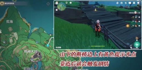 7、根据提示前往鸣神大社东北方向山下的断桥位置,玩家可以直接从鸣神大社飞下来,靠近后即可触发剧情;