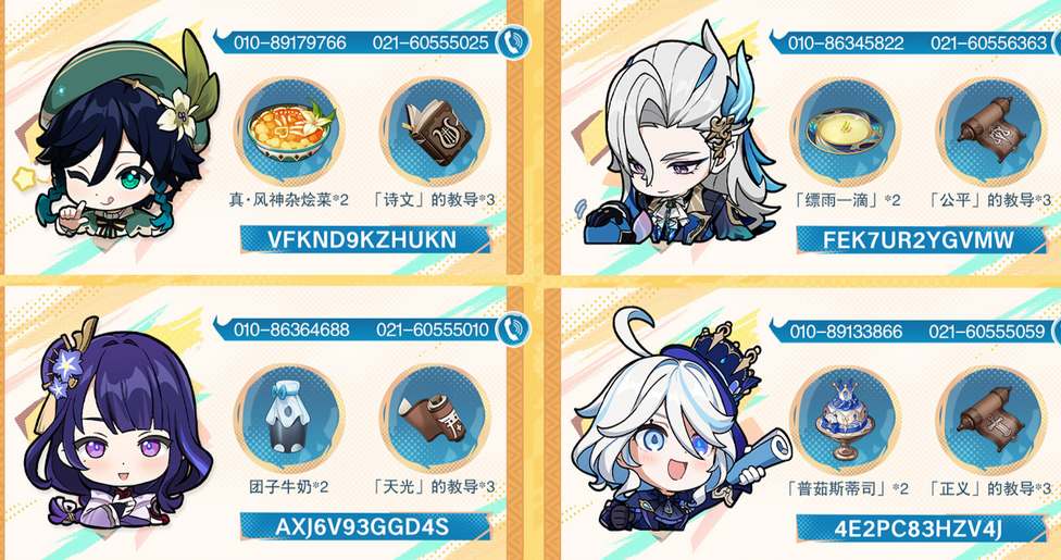 原神5.0踏入烈日前电话活动提供了5个礼包兑换码,在10月9日0点之前可以兑换奖励。本次活动中每个角色分别对应一个兑换码。下面为大家整理了踏入烈日前活动的所有礼包,玩家们可以参考以下的攻略前往游戏内完成兑换。